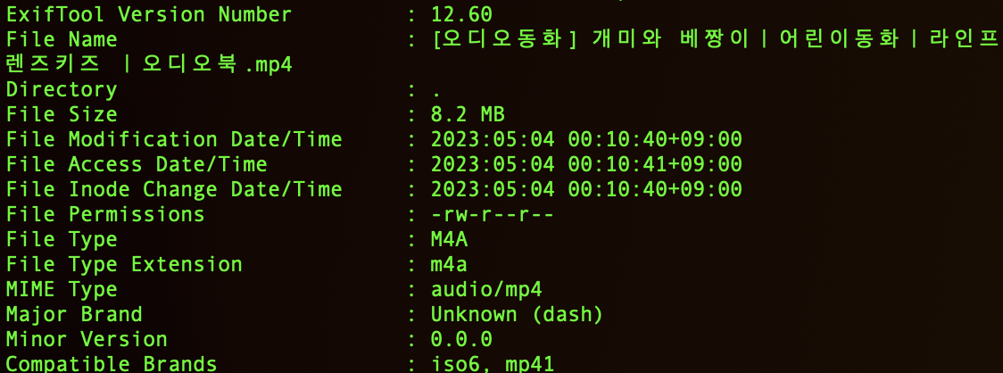 다시 아까 다운로드 받은 mp4음원으로 돌아와서 exittool로 어떤 오디오 속성인지 확인해줍니다.